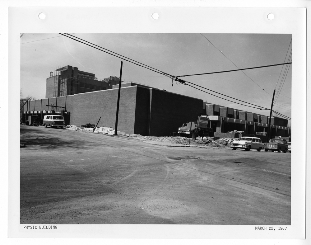 The building designed in the early 1960s accommodated the type of research then being performed by the faculty of the School. Then the research involved small equipment. For the Nuclear group and the Microwave Spectroscopy group an equipment rack was a “large” item. Stevenson had a couple of one meter long evacuable spectrometers. These were the largest items that needed to be accommodated above the first floor. The X-ray diffraction equipment of Young’s group was basically table top facilities. Only the high energy atomic Physics group with their Van der Graaff and extensive vacuum facilities involved any sort of “large” equipment; and they were not being moved. So, the School was designed for small research equipment. For that reason the elevator is small and quite inadequate for the movement of freight. The main doors to the four labs on each floor all open onto a restricted corridor and have little room for maneuver. There is no loading dock. Only the two rooms allocated to McDaniel, Martin, and Thomas had any heavy lifting facility (moveable pulley systems mounted on the ceiling). No provision was made for exhausting pump fumes. The various building deficiencies that became apparent over the next twenty years were due to its having been designed for research of a different era—for the past rather than the future. building As soon as we moved in, we discovered two obvious deficiencies of the. First, the lighting in the four large lecture rooms was quite inadequate, and second, the chalkboards were too low. The lighting got fixed; the boards remain too low today. Also, as the faculty moved into offices they found little metal boxes protruding from the middle of the floor that provided electrical outlets. These set unreasonable constraints on the placement of furniture and also tripped up many a person in those first years. Apparently somebody misread a blue print and put the outlets in the floor rather than in the walls.