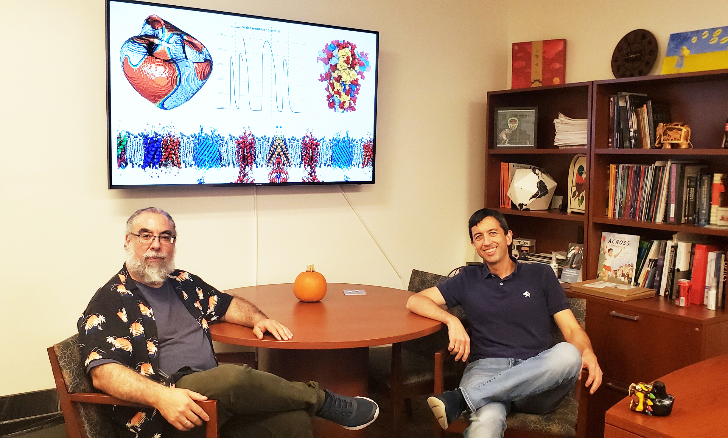 “The disparate scales on which we work — my lab on individual proteins and Flavio’s on entire organs — makes it hard to bridge the gap,” said Gumbart. “But we are always on the lookout for new opportunities. Even if we haven’t collaborated very often in research, we often discuss other things such as outreach and teaching,” He added. “For example, when I taught my first Introductory Physics class, I sat in on Flavio’s section every morning before my own to observe how to best convey the difficult concepts being covered that day.”