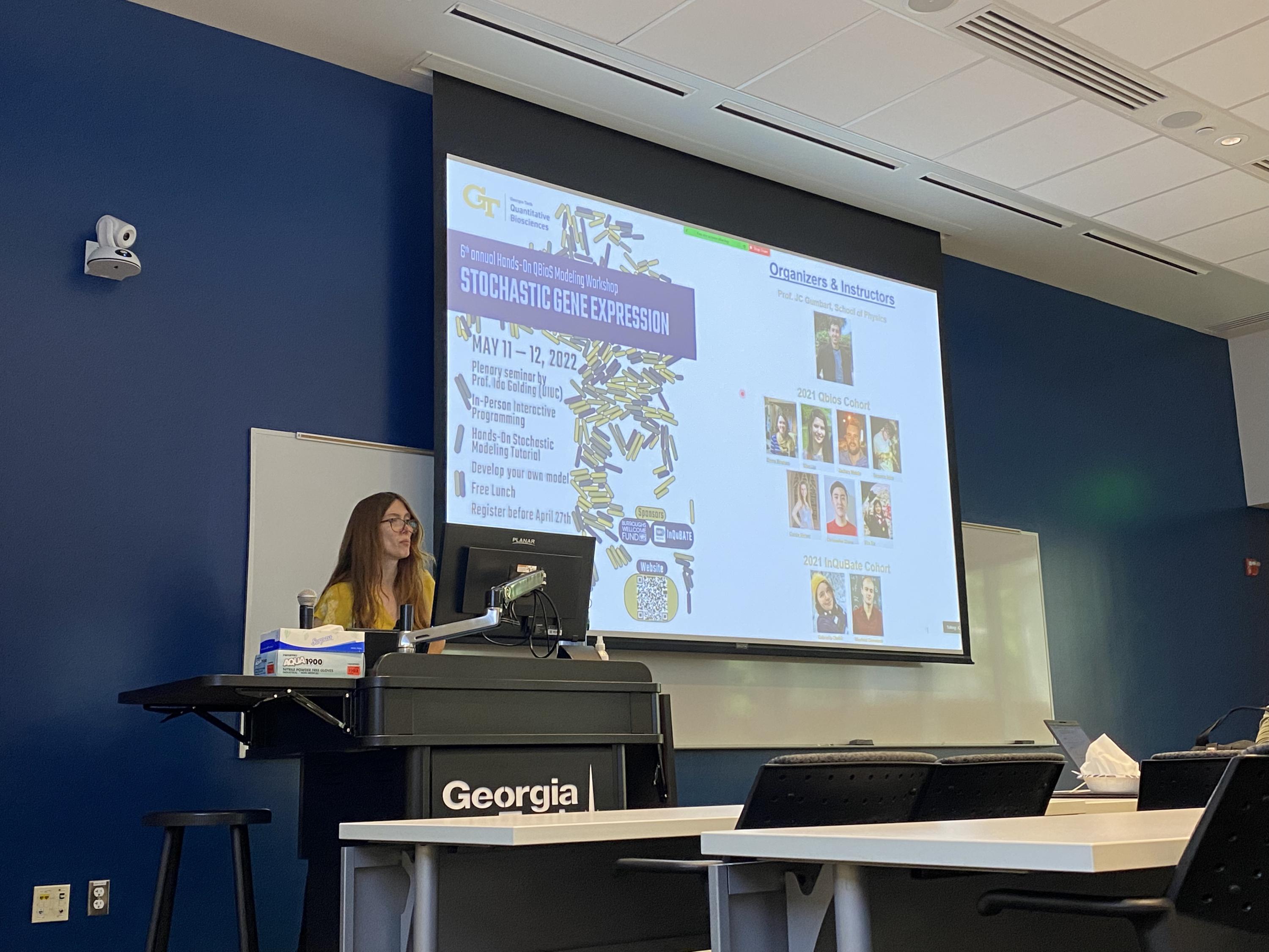 The workshop opened with a lecture on the event’s theme, stochastic gene expression, delivered by Adriana Lucia-Sanz, postdoctoral researcher in the Weitz Group at Georgia Tech, which is led by Joshua Weitz, professor and Tom and Marie Patton Chair of Biological Sciences and founding director of the Quantitative Biosciences program. The attendees then broke into smaller groups led by organizers to work through hands-on modeling tutorials in various programming languages.